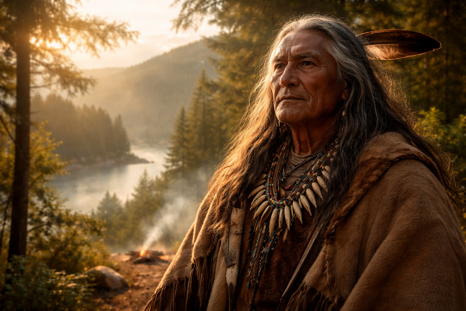 Interpretació artística del Cap Si’ahl, integrat en un paisatge natural i càlid. No es tracta d’un retrat històric real, sinó d’una representació simbòlica respectuosa.